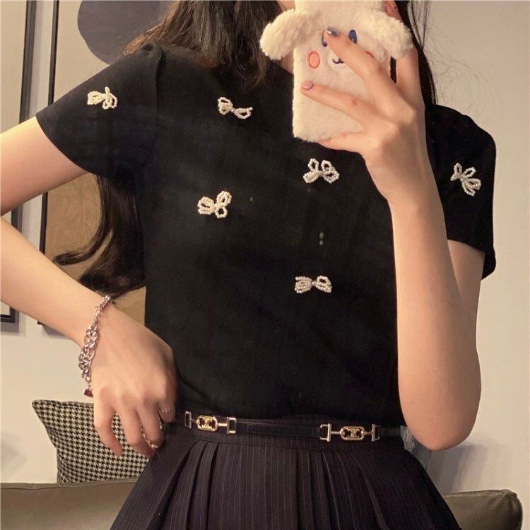 【レディース】トップス ブラック ビーズフラワー Tシャツ