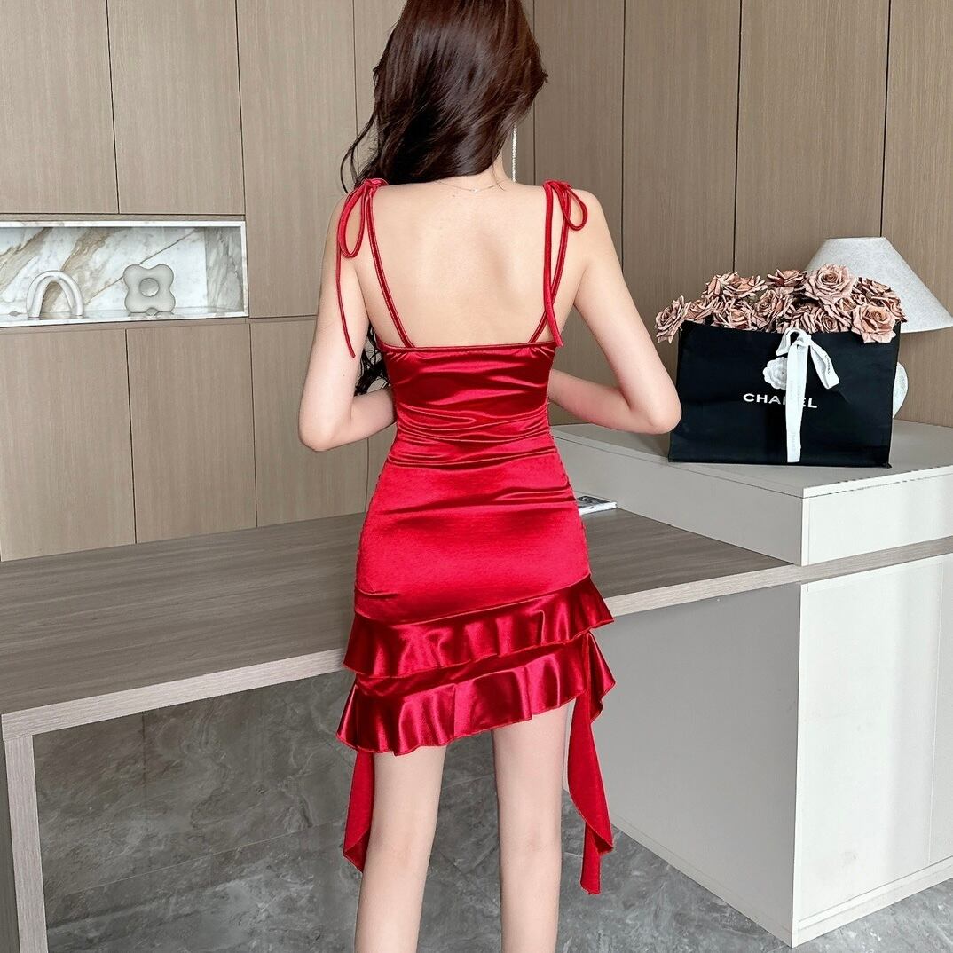 【レディース】パーティドレス テカテカ アシンメトリー ショートドレス