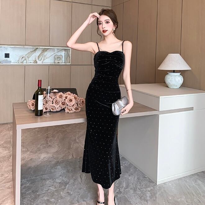 【レディース】パーティドレス ブラック ドット柄 タイト ロングドレス