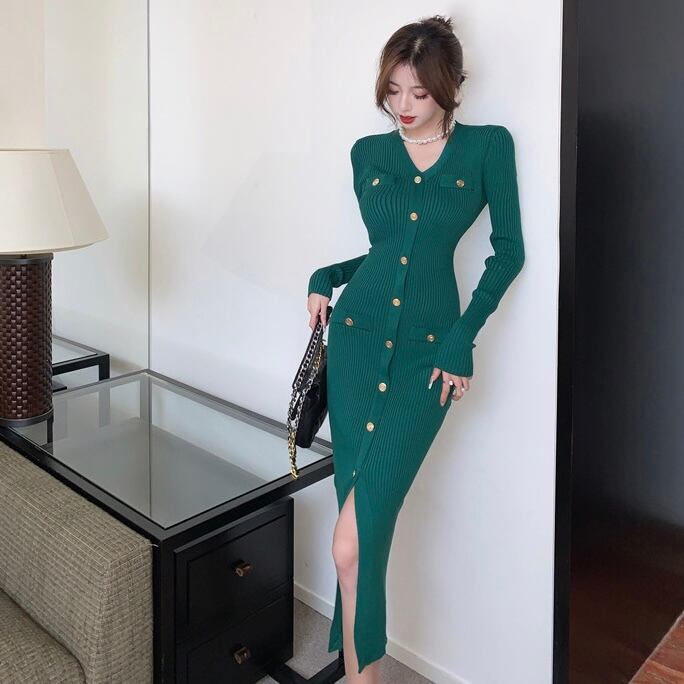 【レディース】パーティドレス Vネック ロングスリーブ ボディコン ロングドレス
