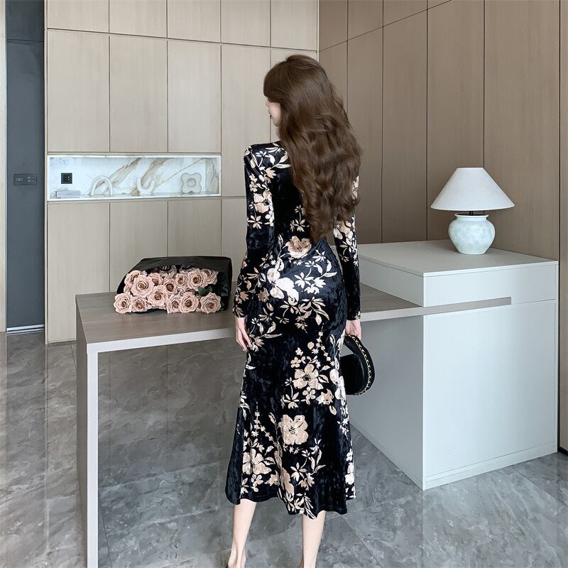 【レディース】パーティドレス ブラック フラワー タイト ミディアムドレス